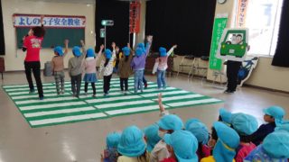 令和5年2月20日に、吉野おげんきかい&吉野校区安心安全ネットワーク会議の共催で『よしのっ子安全教室』を開催しました。吉野地域の未就学児を対象に、交通安全や不審者対策(いかのおすし)について知ってもらう教室です。①交通安全協会指導係による交...