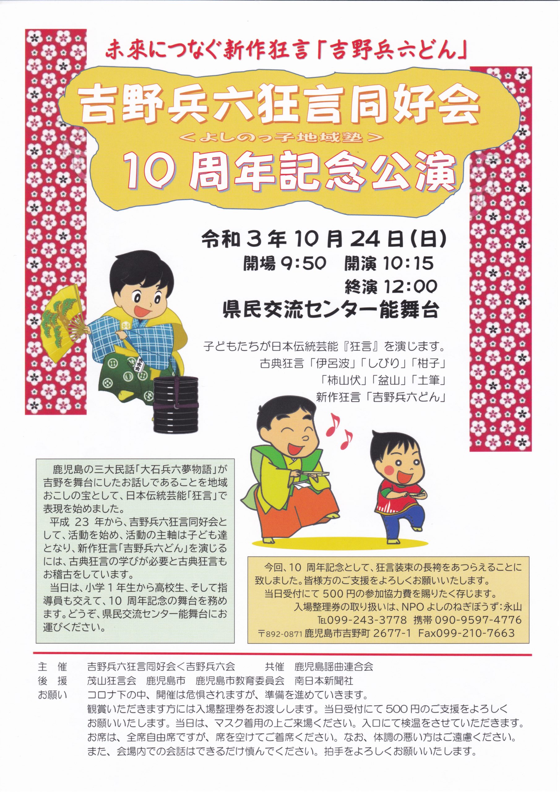 吉野兵六狂言同好会<吉野兵六会では、令和3年10月24日に10周年記念公演を開催します。