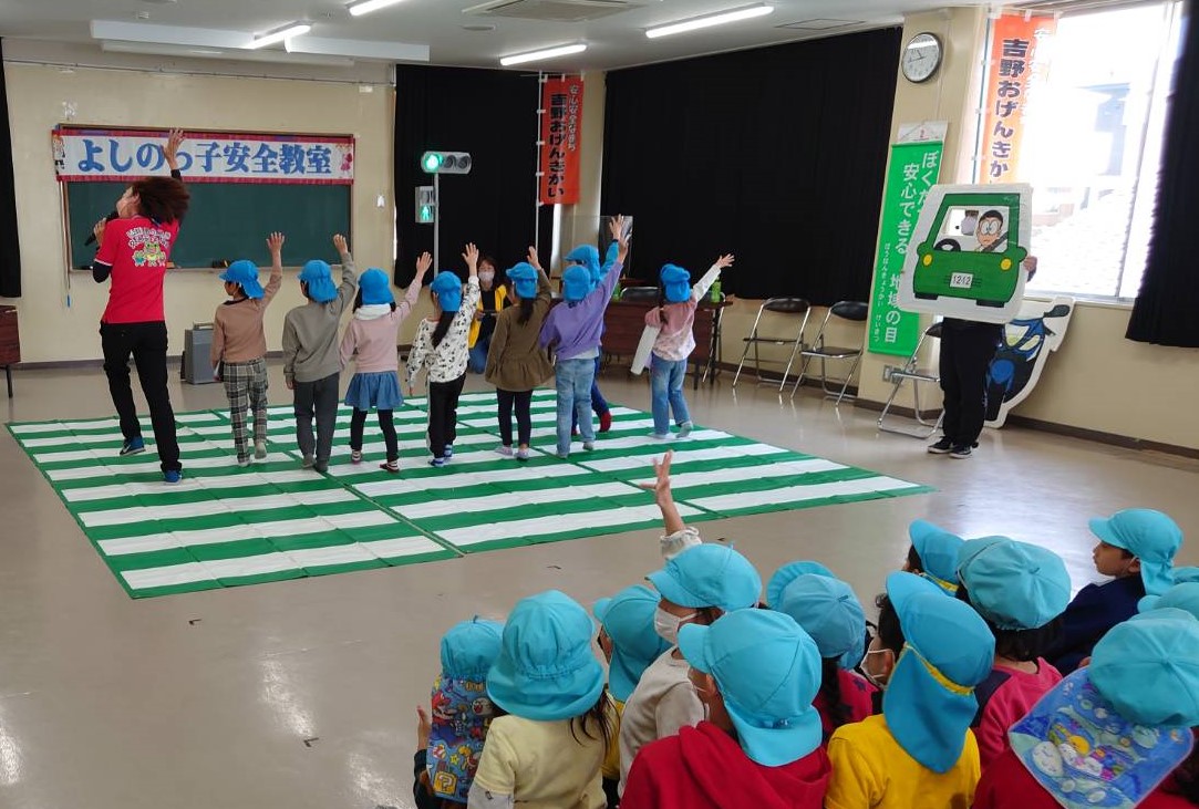 令和5年2月20日に、吉野おげんきかい&吉野校区安心安全ネットワーク会議の共催で『よしのっ子安全教室』を開催しました。吉野地域の未就学児を対象に、交通安全や不審者対策(いかのおすし)について知ってもらう教室です。