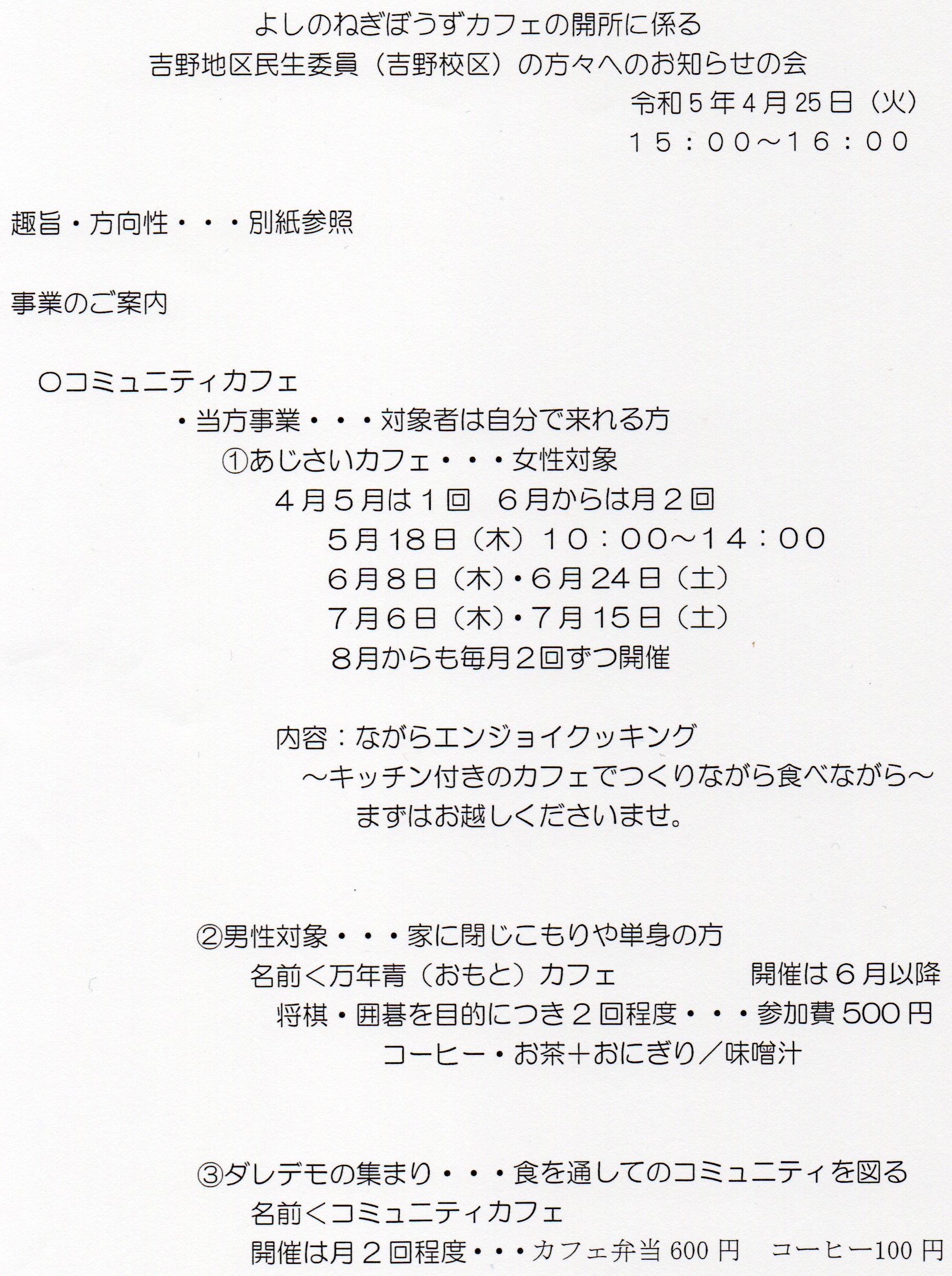 NPO法人地域サポートよしのねぎぼうずでは、事務所のある建物にて、3つのコミュニティカフェを開設いたします。