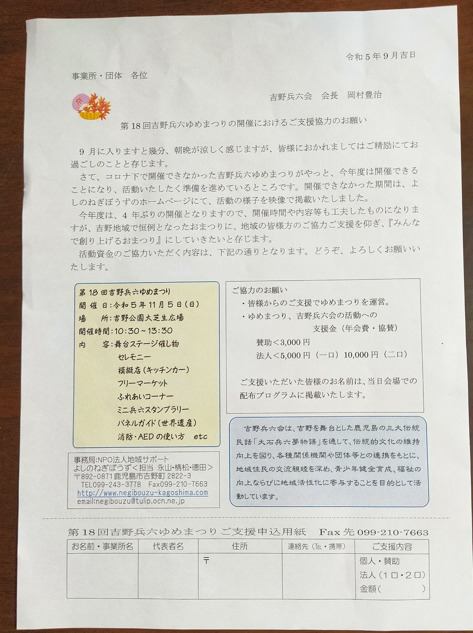 開催時間や内容なども工夫し、吉野地区で恒例となったおまつりに、地域の皆様方のご協力やご支援を仰ぎ「みんなで創り上げるおまつり」にしていきたいと存じます。