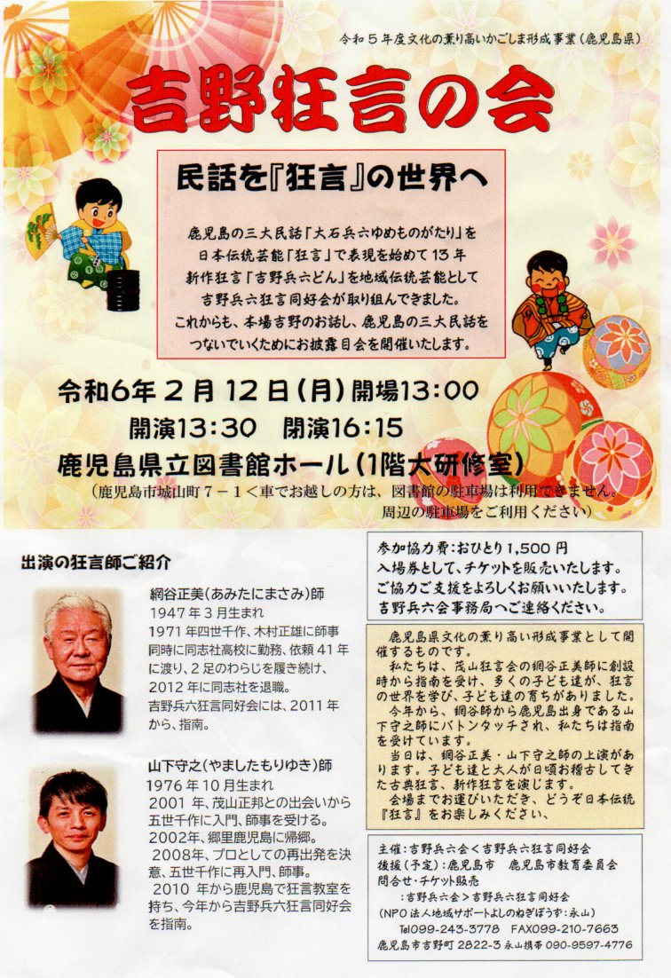 吉野兵六狂言同好会では、2月12日(月)に鹿児島県立図書館のホールにて、狂言の自主公演をいたします。