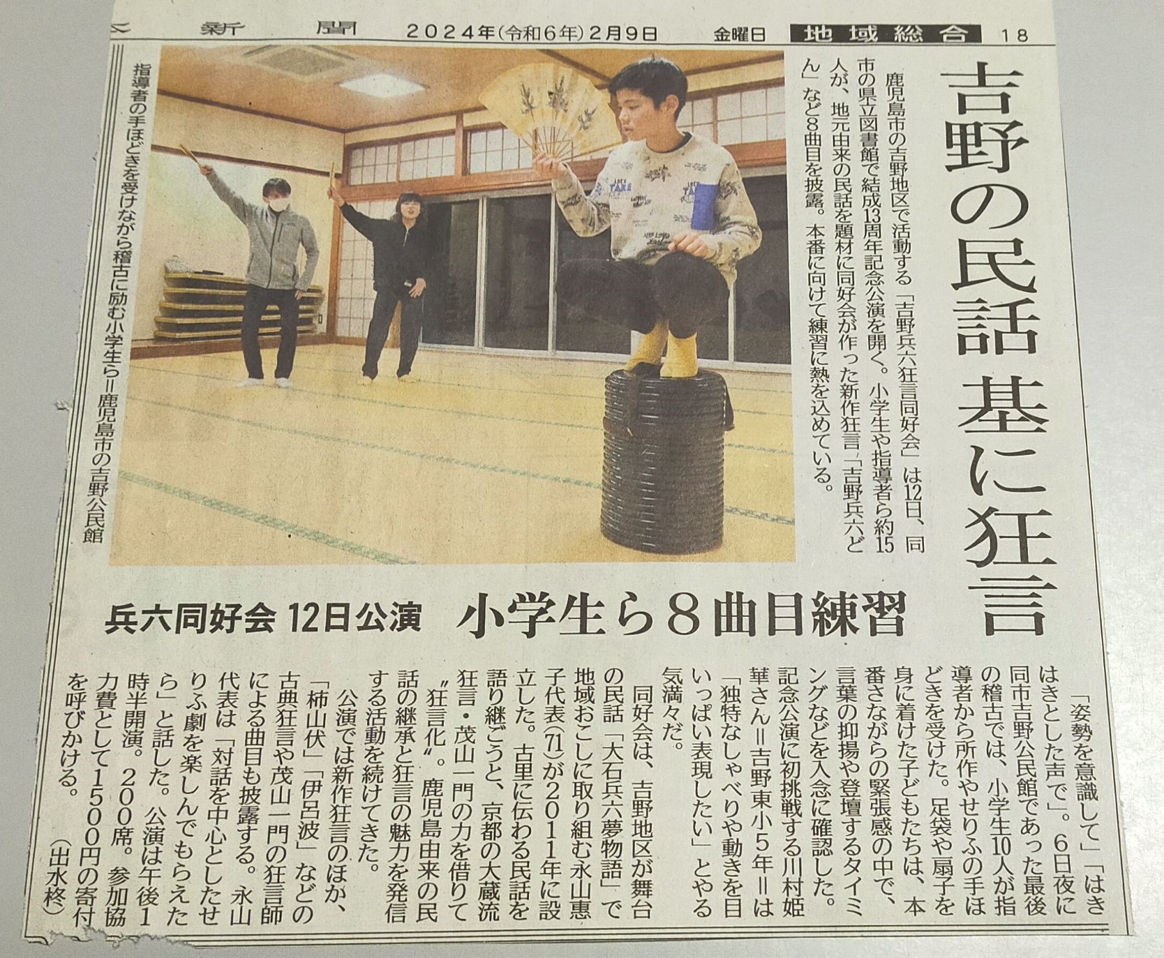 2月12日に鹿児島県立図書館のホールで行う「吉野兵六狂言同好会の記念公演」について、2月9日の南日本新聞の記事にて紹介をしていただきました。
