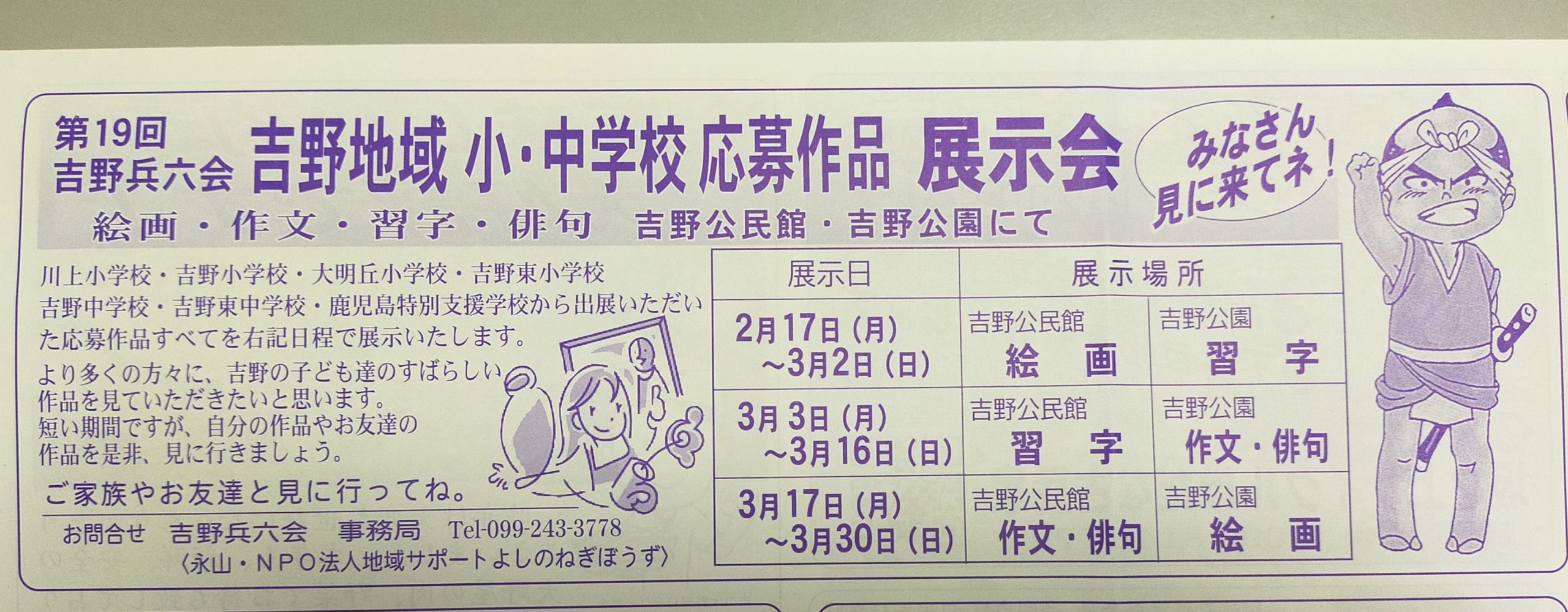 2月17日(月)~3月30日(日)まで、地域小中学校から応募された作品の展示会(絵画・習字・作文・俳句)を、吉野公民館・吉野公園にて開催します。