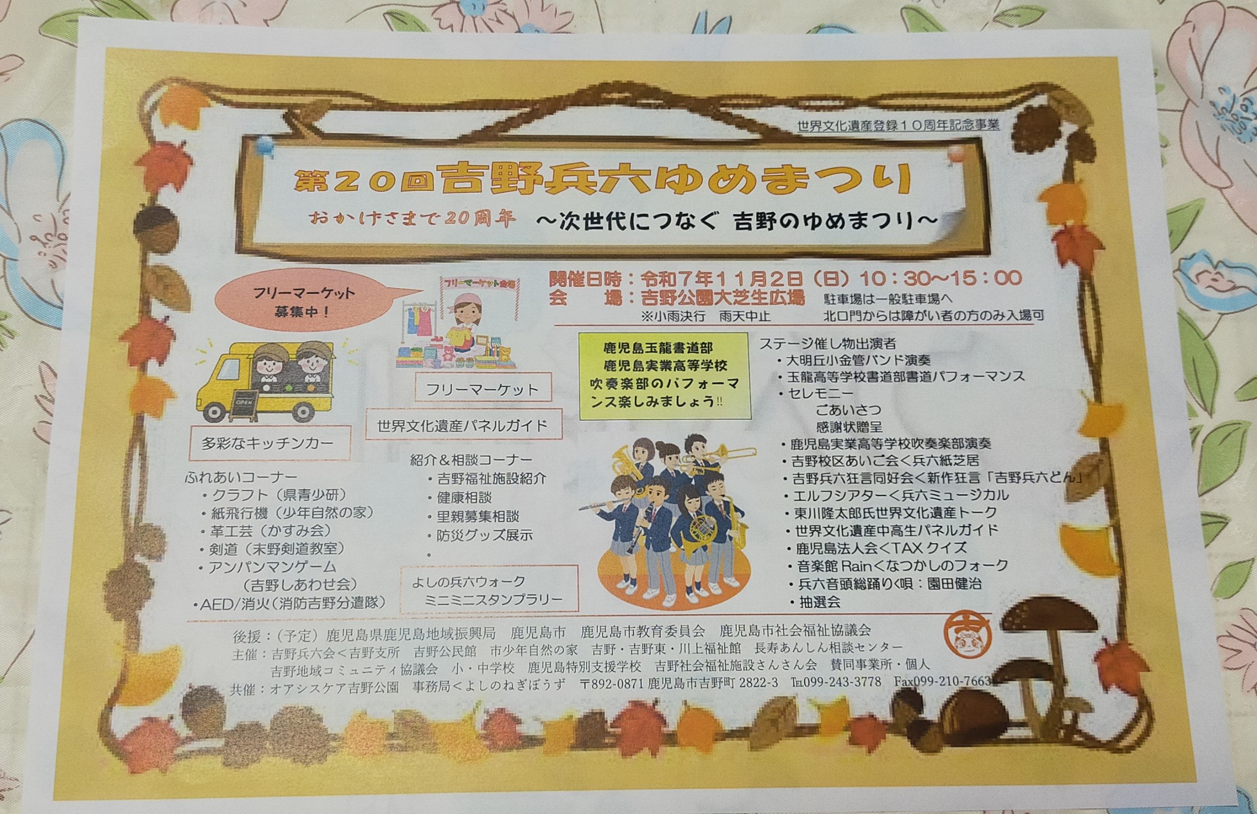 令和7年11月2日(日)に、吉野公園大芝生広場にて『第20回吉野兵六ゆめまつり』を開催します。10時30分~15時まで行います。