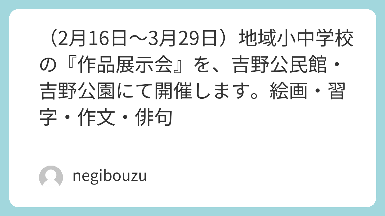 2月16日(月)~3月29日(日)まで、地域小中学校から応募された作品の展示会(絵画・習字・作文・俳句)を、吉野公民館・吉野公園にて開催します。