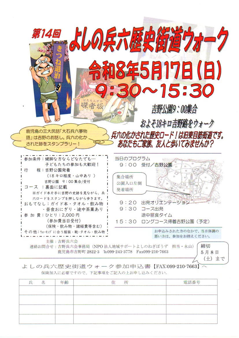 お知らせ2026年5月17日(日)開催予定の『第14回よしの兵六歴史街道ウォーク』の参加者を募集しています。