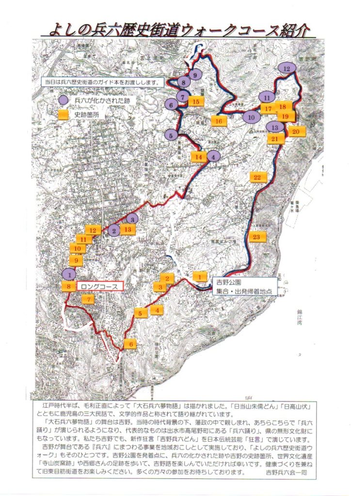 朝9時に吉野公園に集合、9時30分から大石兵六物語の舞台(約18キロ)を歩いていきます。お申し込みは、「お電話」「FAX」「ホームページお申込みフォーム(このページ下部)」よりお寄せくださいませ。